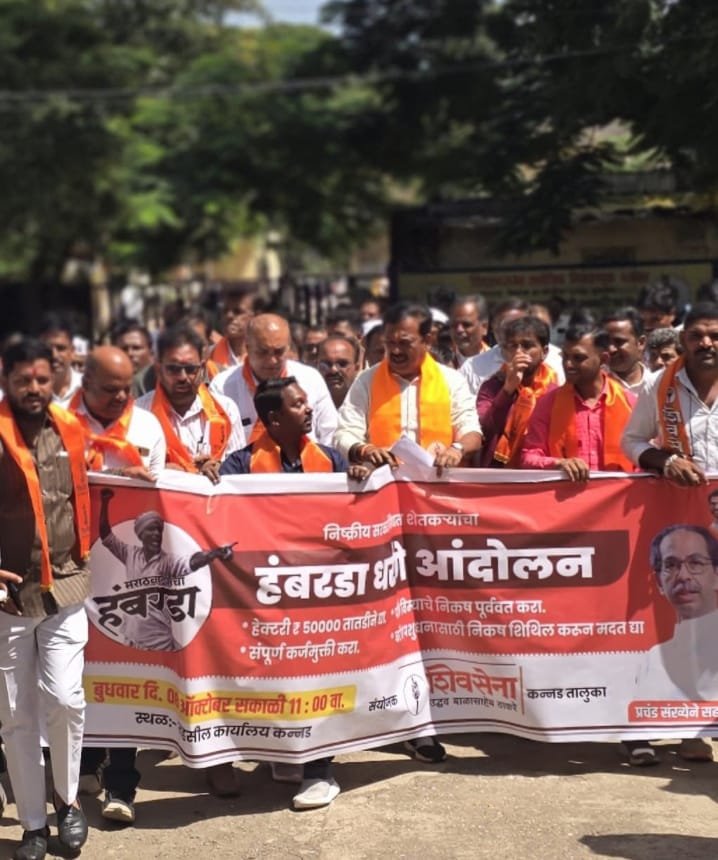 कन्नड़ संवाददाता – शिवसेना उबाठा द्वारा 8 अक्टोबर बुधवार को पुरे राज्य के जिलाधिकारी कार्यालय तथा तहसील कार्यालयों पर मोर्चा आंदोलन कर के राज्य शासन से मांग की गई है के राज्य की सर्कार में बैठे महायुती ने चुनाव से पहले चुनावी एजंटे में कहा था के यदि वह सर्कार में आते है तो किसानो के कर्ज माफ़ करेंगे किन्तु महायुती की सर्कार बन्ने के बाद एक वर्ष से अधिक समय होजाने पर भी सर्कार ने किसानो से कर्ज माफ़ी का वादा पूरा नहीं किया है इस लिए इस वर्ष राज्य में भयानक अतिवृष्टि के कारण किसानो की फासले तबा बर्बाद होगई है ऐसे में अभी किसानो की बिकट स्थिति बनी हुई है इस लिए किसानो का कर्ज माफ़ किया जाए साथ हि किसानो की फसलो की नुकसान भरपाई दिजाए इस तरह की मांग शिवसेना उबाठा द्वारा की गई कन्नड़ में पूर्व विधायक उदयसिंग राजपूत के नेत्वृत में तहसीलदार विद्याचरण कड़वकर को ज्ञापन सौपा गया इस अवसर पर जिलापरिषद के पूर्व अध्यक्ष डॉ अन्ना शिंदे तहसील अध्यक्ष संजय मोटे सहित बड़ी संख्या में कार्यकर्ता उपस्थित थे.